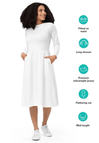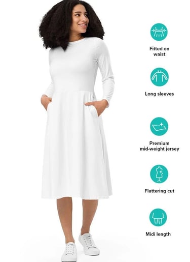 This isn't just a dress—it's wearable art. With a flattering midi silhouette, fitted waist, flowing hem, and vibrant all-over print potential, the All-Over Print Long Sleeve Midi Dress brings together comfort, confidence, and creativity in one standout piece. From coffee dates to gallery openings, this dress transitions as effortlessly as you do.