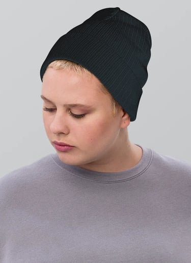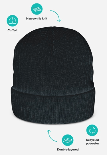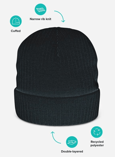Stay cozy and stylish with this eco-conscious ribbed knit beanie. Made from a soft blend of 50% recycled polyester and 50% acrylic, it features a double-layer knit and classic cuffed design for extra warmth. Its natural tones and ribbed texture make it a versatile winter essential that pairs easily with any outfit — perfect for custom embroidery with your unique touch.